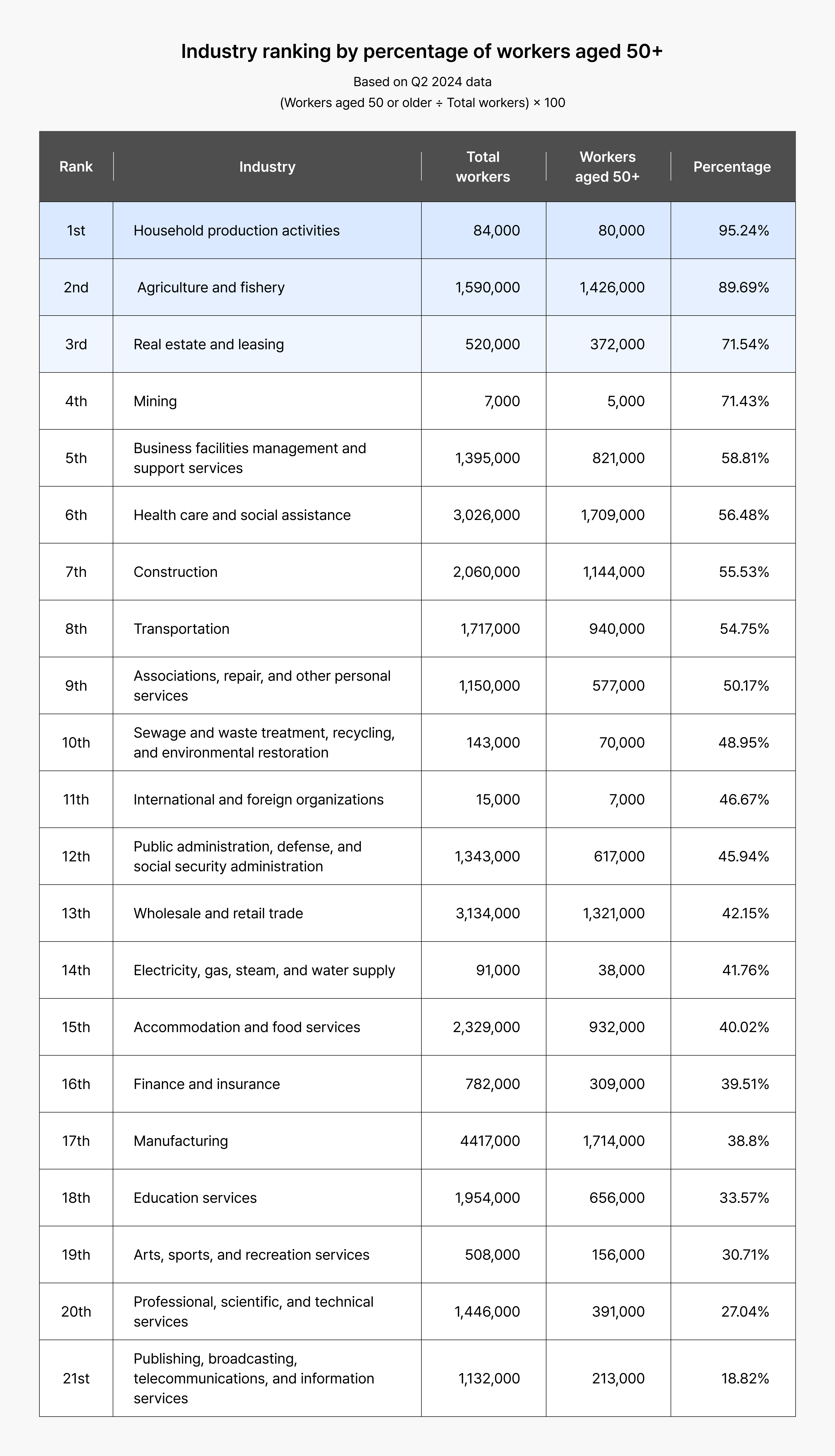 [Figure 2]: Industry ranking by percentage of workers aged 50+ (Q2 2024)