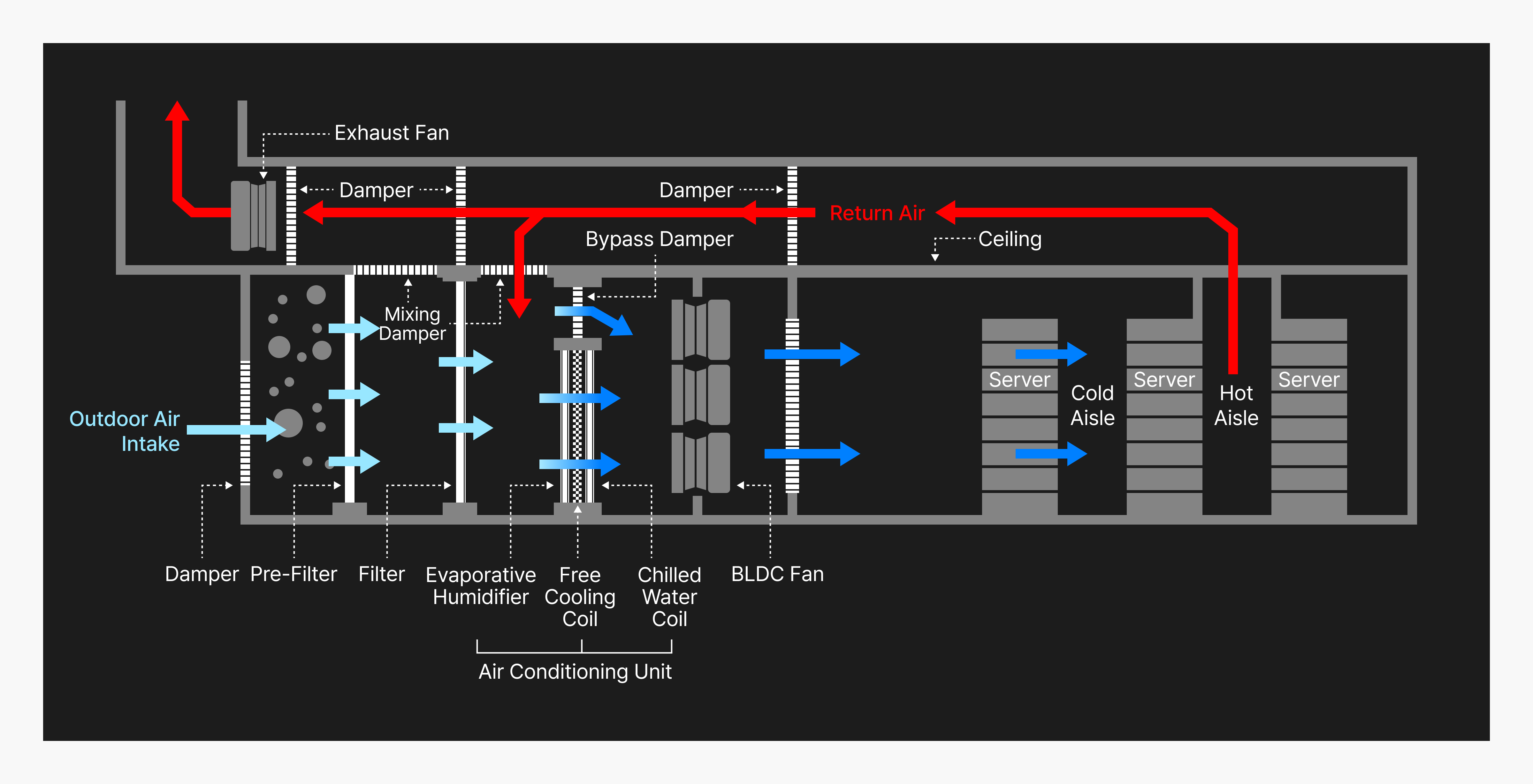 NAMU III, installed at GAK Sejong, uses both direct outside air cooling and indirect outside air cooling, which draws on outdoor air as a heat source. This allows for reliable operation year-round by minimizing the impact of seasonal and environmental conditions. It’s a highly energy-efficient, environmentally friendly cooling technology that flexibly applies the most efficient method based on conditions.