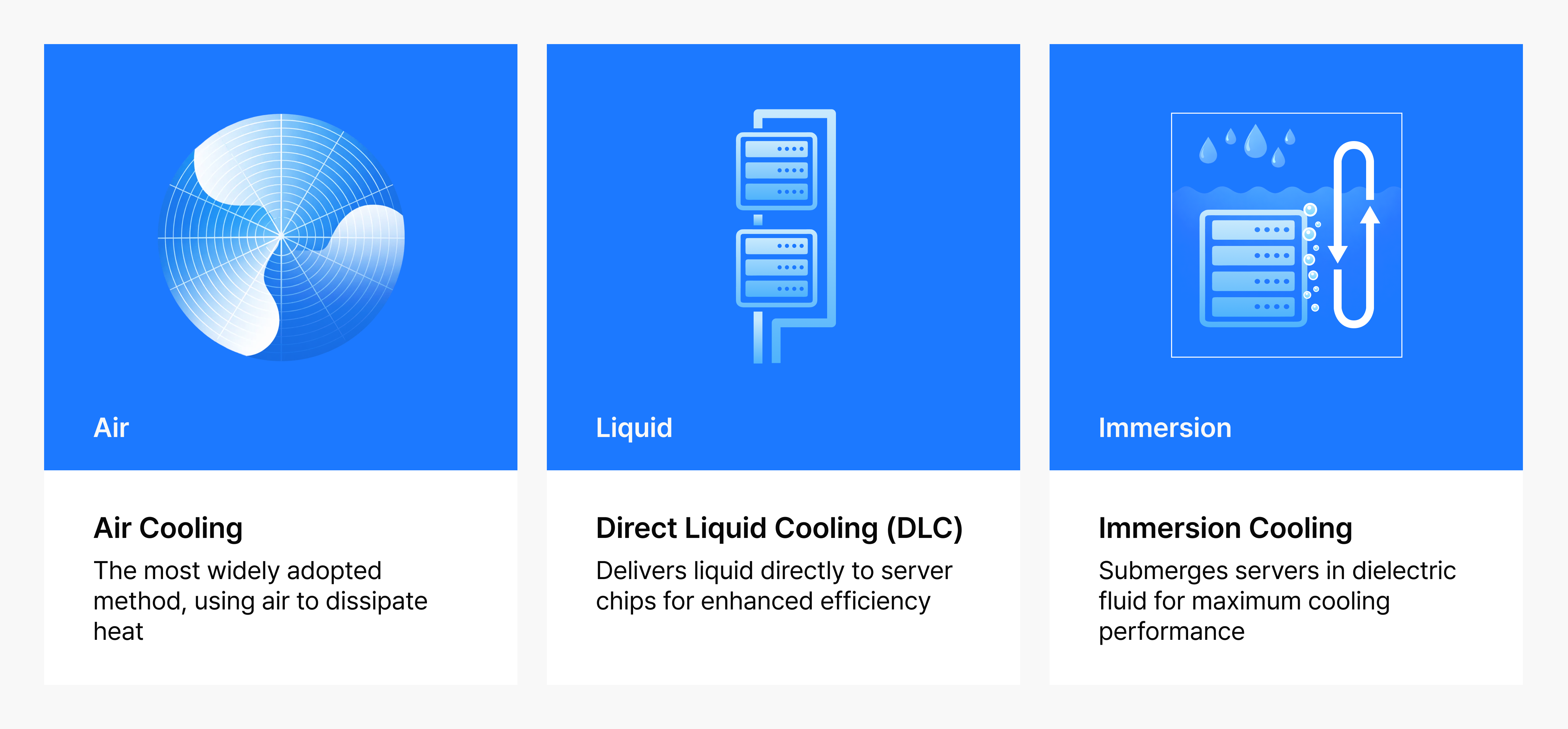 Cooling technologies can be broadly categorized by the medium used to dissipate heat from servers.