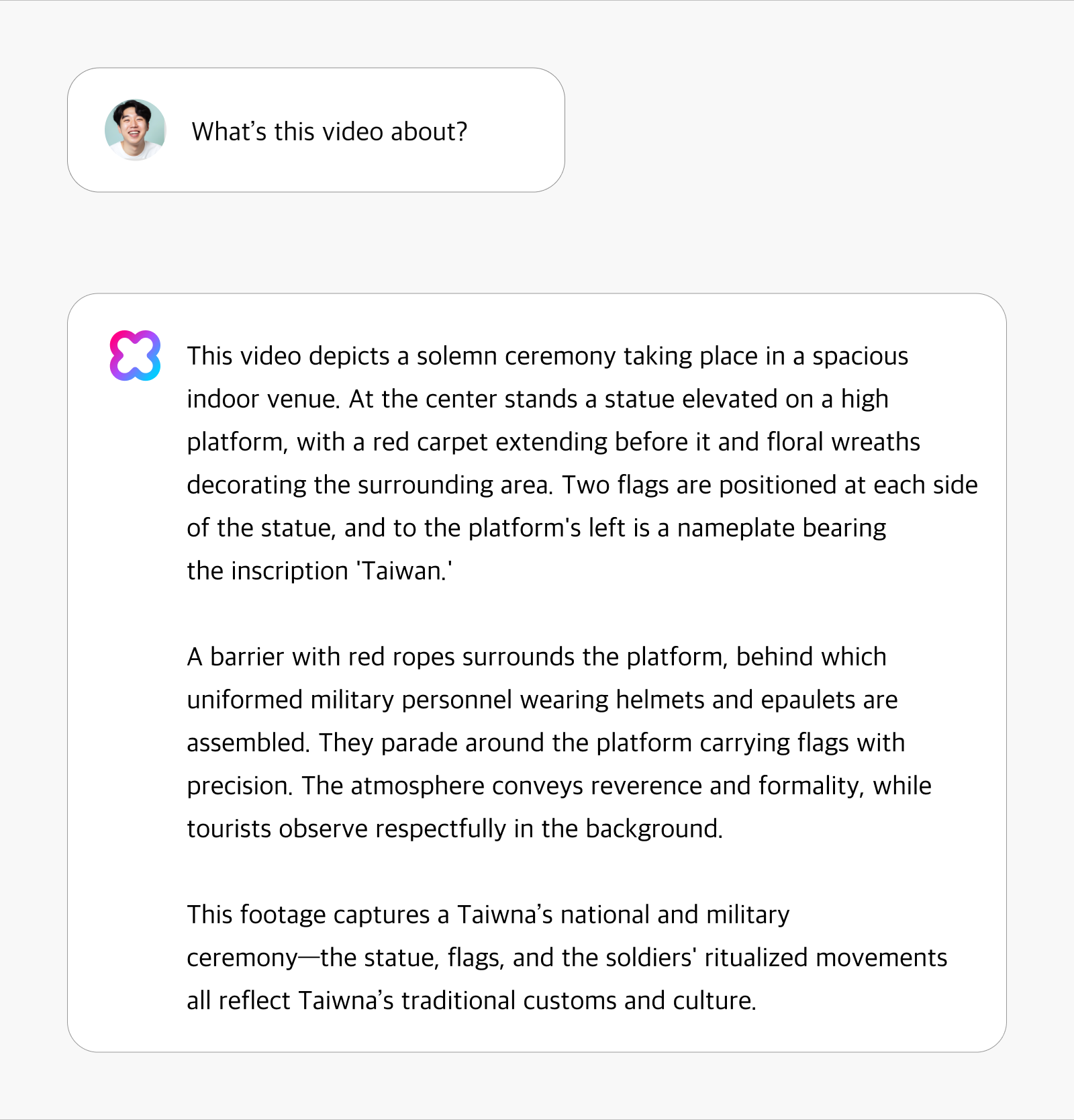 Even without using a dedicated object detection model, HyperCLOVA X Video demonstrates exceptional ability to recognize and describe subtle elements in video content. In the example below, the system showcases its capacity to recognize cultural contexts with remarkable precision. When analyzing footage of a ceremonial event, it not only identifies the occasion as a Vietnamese national and military ceremony but also interprets the cultural significance of specific elements—demonstrating its understanding of Vietnam’s traditional customs and culture.