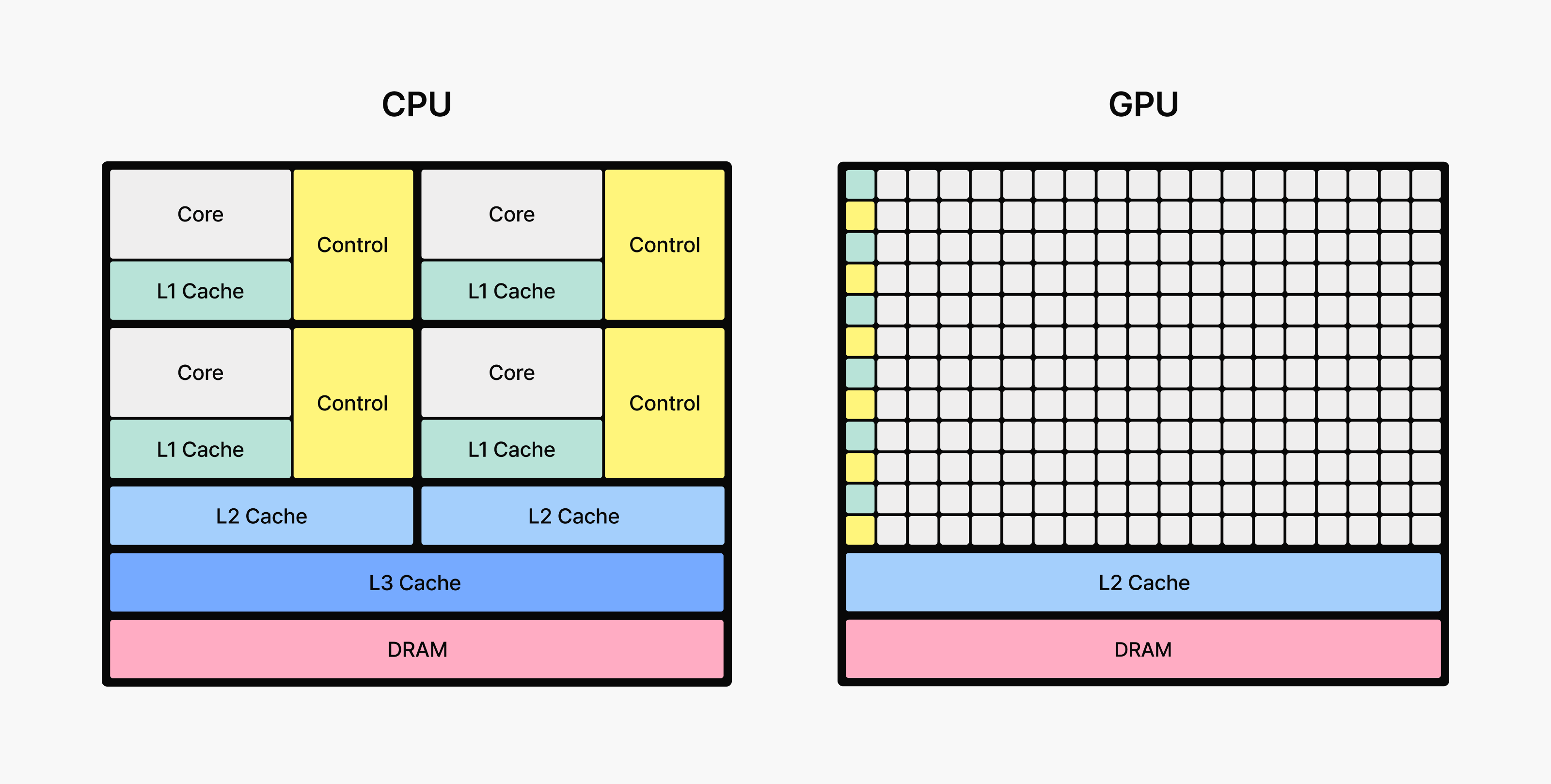 A Graphics Processing Unit (GPU) is hardware specialized for performing these simple but repetitive calculations on a massive scale simultaneously. Originally designed for 3D graphics rendering, GPUs excel at large matrix operations thanks to their thousands of computing cores that can execute identical calculations in parallel. For models that continuously multiply and add massive weight matrices, GPUs are indispensable.