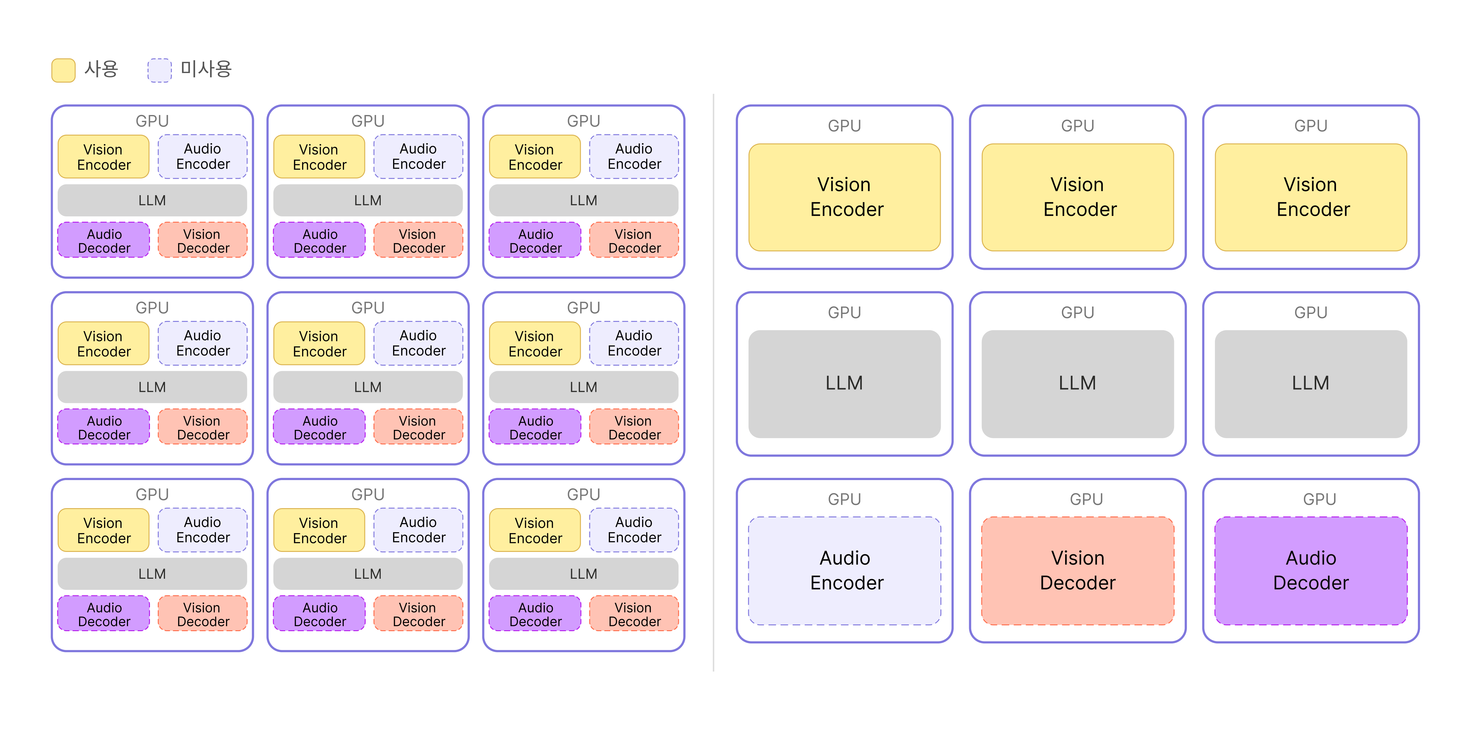 위 그림을 보면 차이를 더 쉽게 이해할 수 있는데요. 왼쪽의 기존 구조에서는 사용하지 않는 기능이 GPU 공간을 차지하면서 자원이 비효율적으로 사용됩니다. 또한 Vision Encoder와 LLM이 하나의 GPU에서 자원을 두고 경쟁하죠. 반면 Encoder, Decoder, LLM을 분리한 구조에서는 각 기능이 GPU 자원을 온전히 활용할 수 있고, 필요한 기능만 선택적으로 확장할 수 있어 자원 낭비를 크게 줄일 수 있습니다.