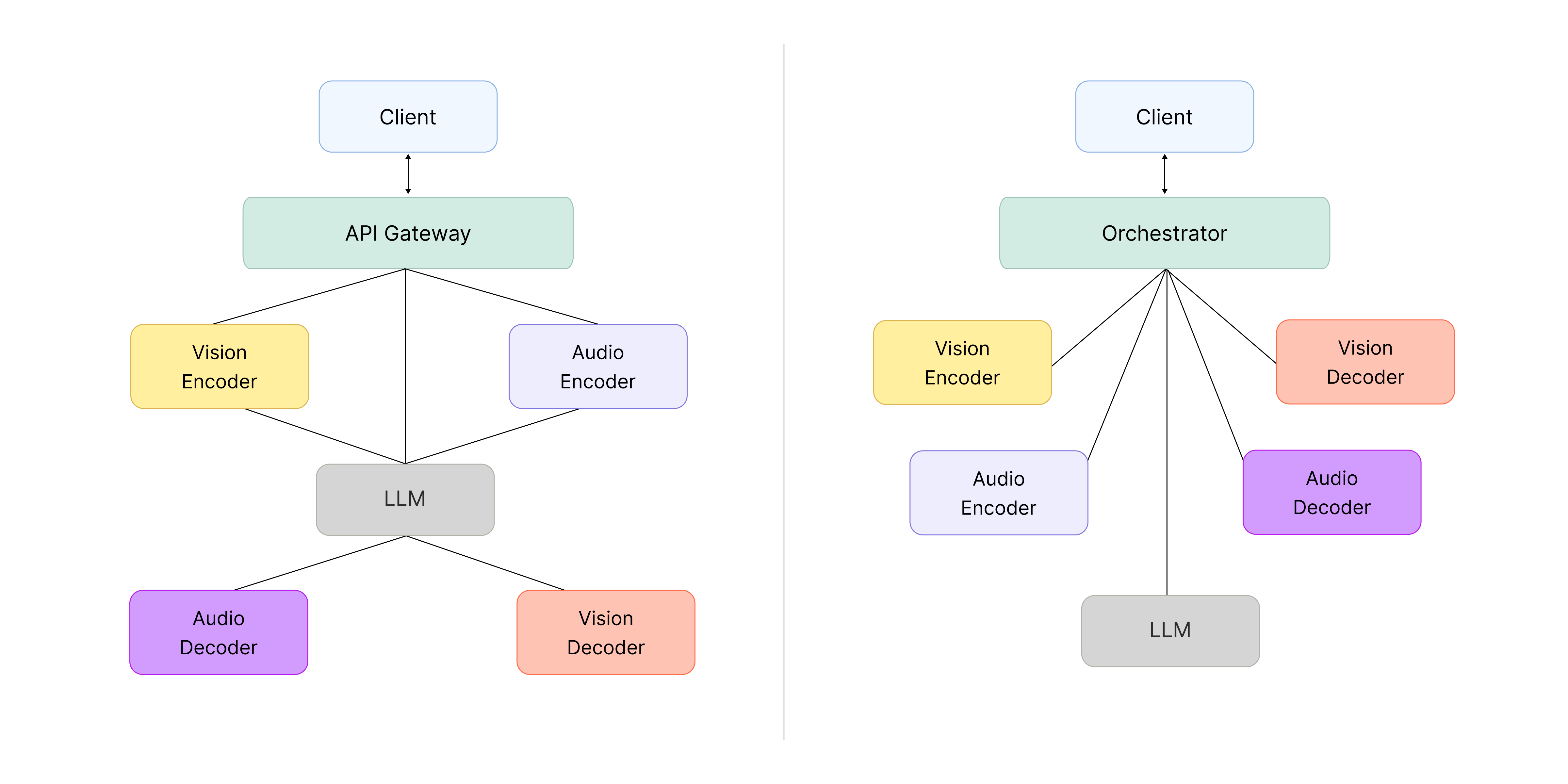 Service Chaining 방식은 새로운 기능을 추가할 때 기존 기능들을 조합해 시스템을 확장할 수 있다는 점에서 유연성이 높은 구조입니다. 하지만 이번 경우에는 옴니모델 자체가 원래 하나의 구조로 통합되어 있기 때문에 Encoder와 Decoder가 LLM에 강하게 결합되어 있어 추가적인 연결을 통해 확장할 필요성이 크지 않았습니다. 또한 개발 기간이 짧은 상황에서 기능 간 호출이 분산된 구조를 선택할 경우, 문제가 발생했을 때 호출 흐름을 추적하며 디버깅하는 과정이 복잡해지고, 이는 곧 전체 개발 속도 저하로 이어질 수 있다는 리스크가 있습니다.