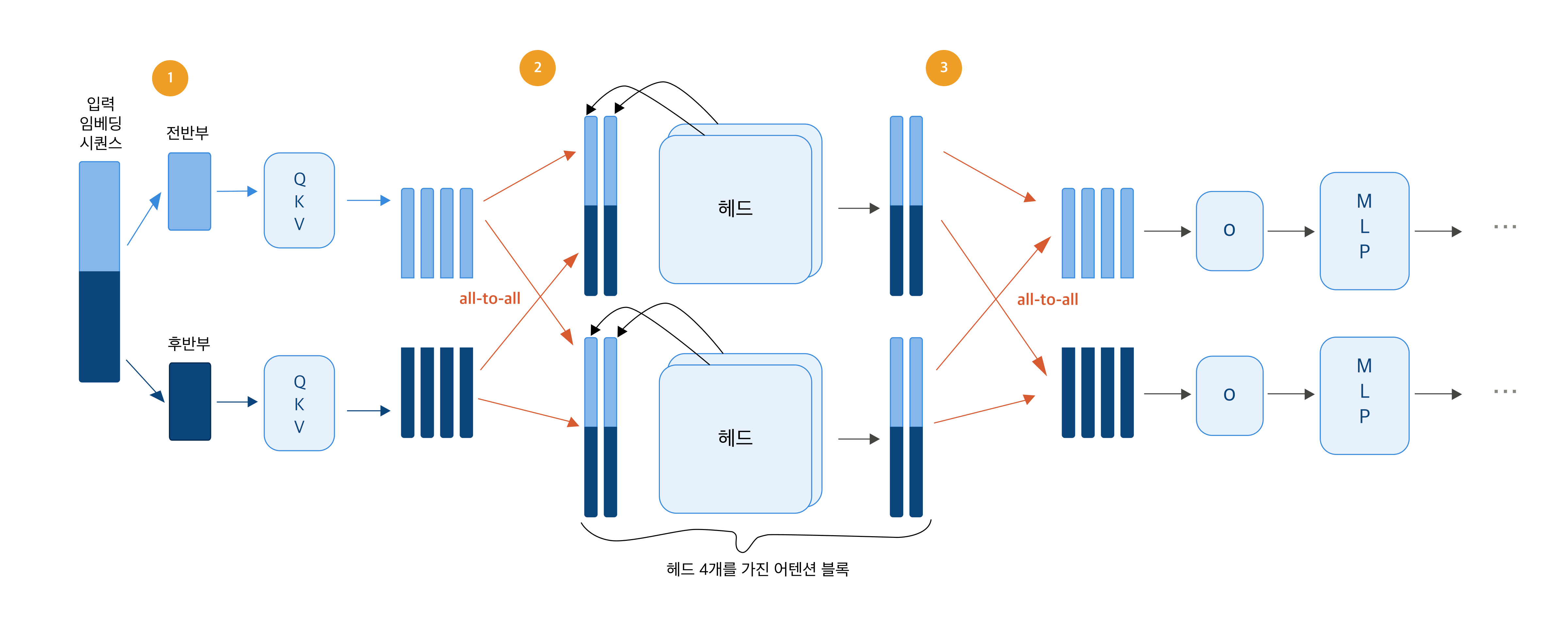 앞뒤 토큰이 서로 어떤 관계인지 파악하는 단계인 어텐션 계산에서는 모든 토큰 간의 관계를 알아야 합니다. 그래서 이 단계에서 단 한 번, GPU 간에 QKV 정보를 모두 교환하는데요. 이것을 All-to-All 통신이라고 합니다. 이후 각 GPU는 전체 내용을 여러 관점에서 동시에 분석하는데, 서로 다른 관점(Attention Head)을 맡아 병렬로 어텐션을 계산합니다.