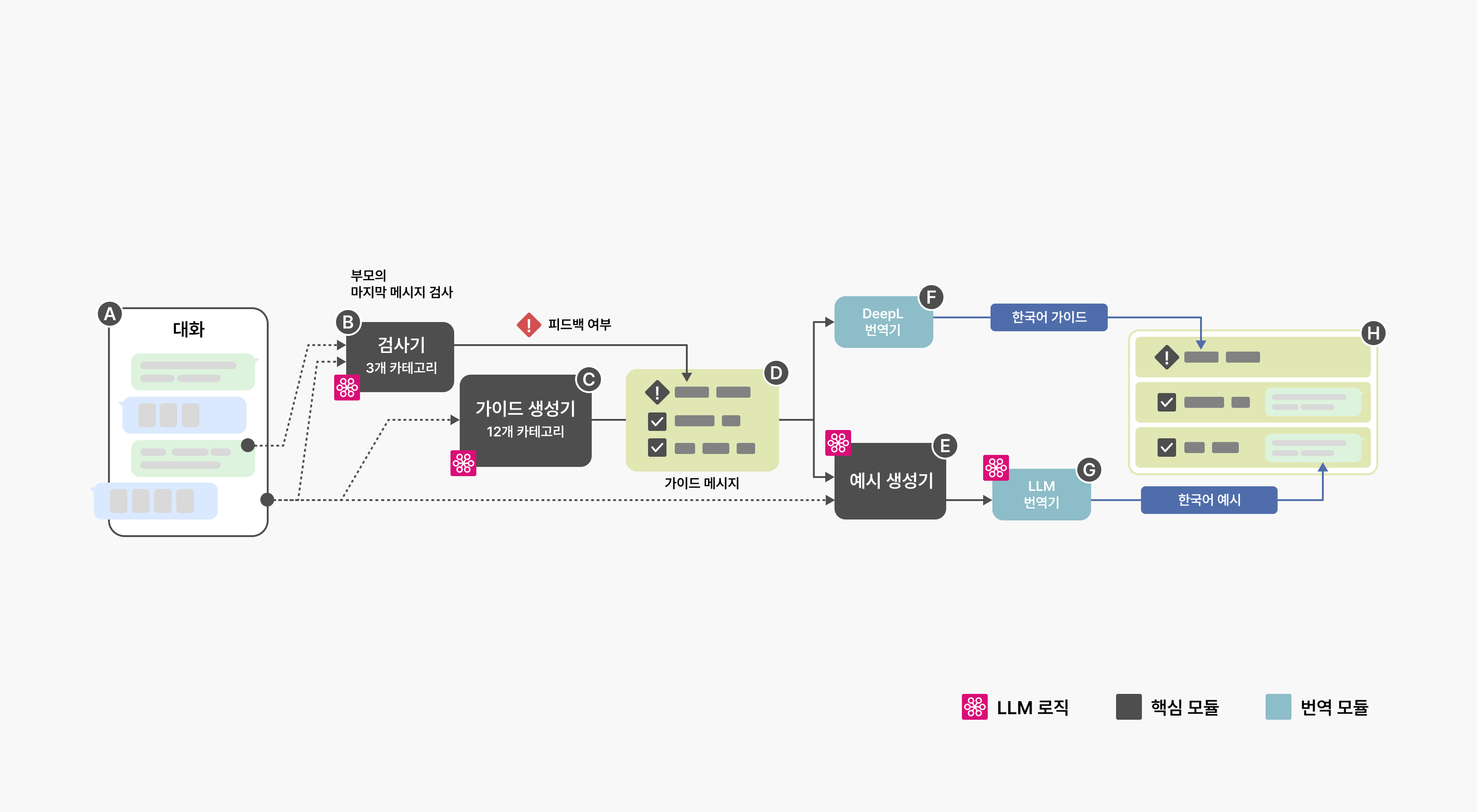 [그림 1: 부모를 위한 가이드라인 생성 방식. 현재 대화(A)를 분석하여 예시 메시지(H)가 포함된 부모 가이드라인 생성]