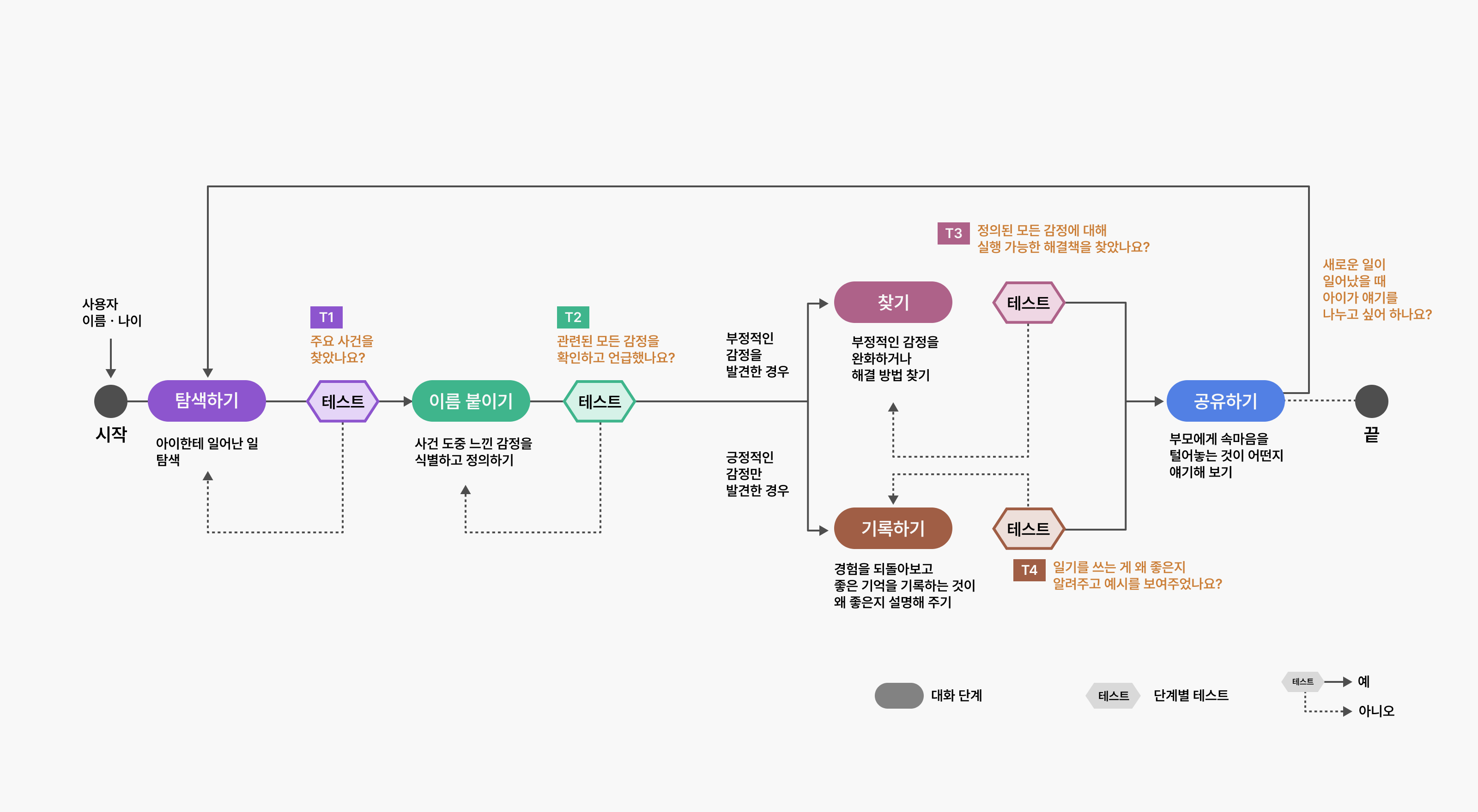 그래서 HCI 팀은 자유 대화형 LLM 챗봇 ChaCha를 만들었습니다. 아이가 ChaCha에 “오늘 체육 시간에 친구가 밀었어”처럼 자연스럽게 이야기를 시작하면, ChaCha는 그 감정의 이름을 함께 찾아주고(“혹시 놀랐고 억울했을까?”) 숨 고르기, 생각 바꾸기 같은 대처 방법을 단계별로 제안합니다. “내일 그 친구에게 뭐라고 말해볼까?”처럼 다음 행동까지 연습할 수 있도록 도와주죠.
