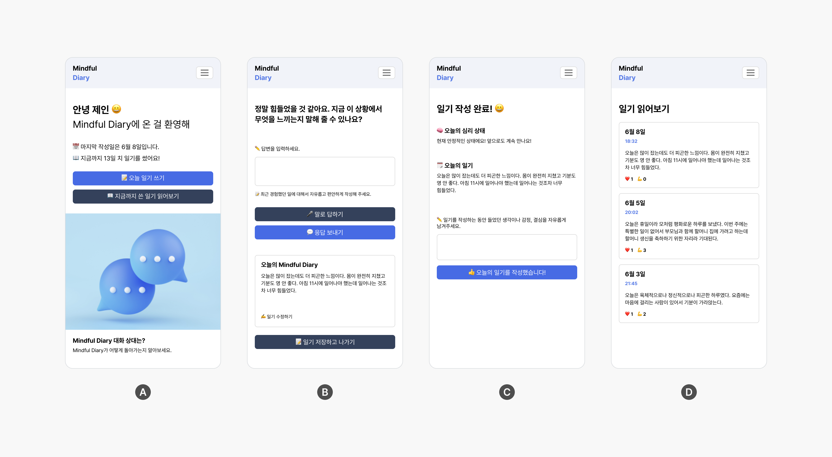 [그림 3: MindfulDiary 앱의 주요 화면. (a) 메인 화면, (b) 일기 작성 화면, (c) 일기 대화를 제출할 때 나타나는 요약 화면, (d) 과거 일기를 표시하는 리뷰 화면]