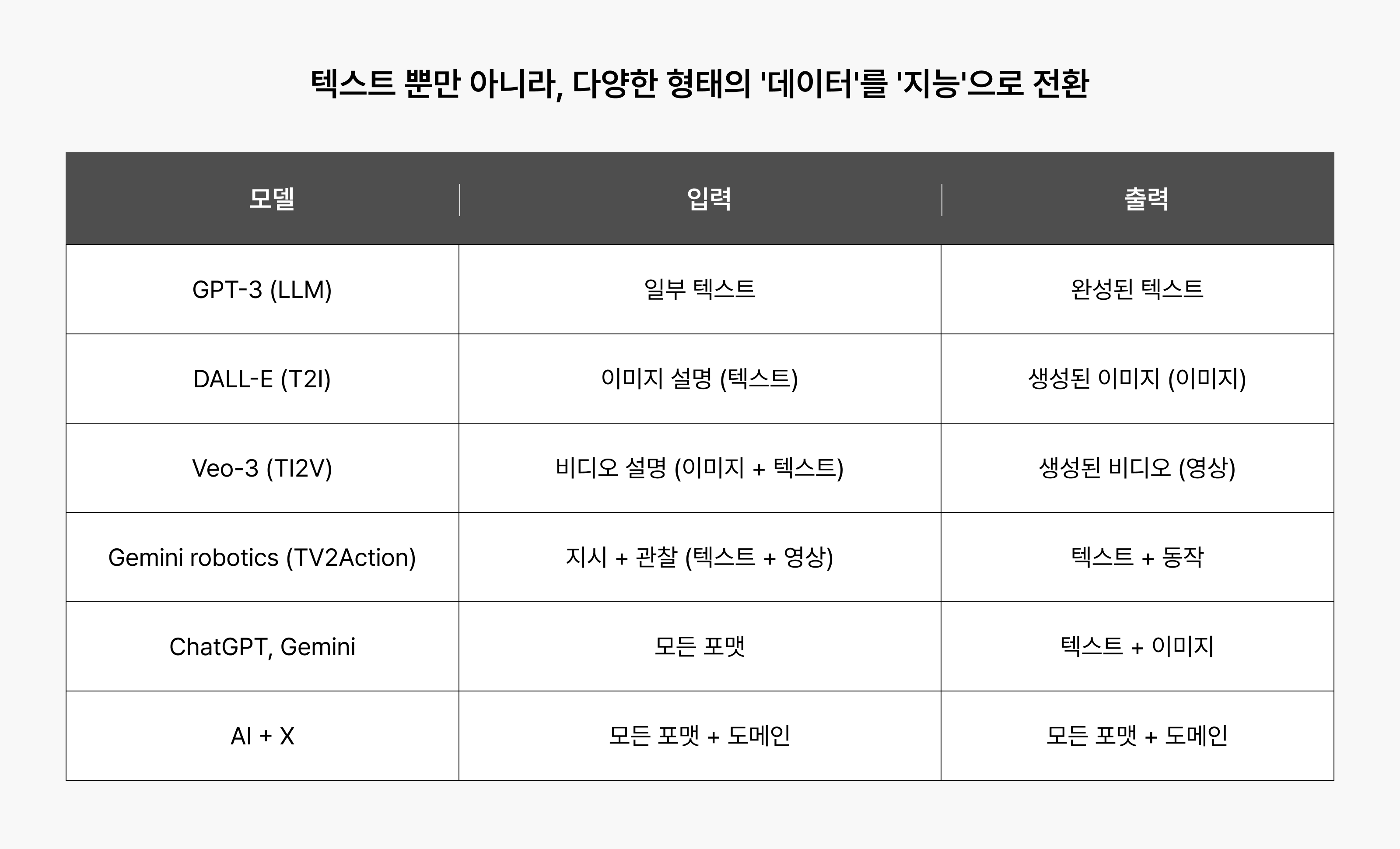 우리가 흔히 떠올리는 AI는 질문을 던지면 답을 내놓는 챗GPT 같은 텍스트 기반 모델입니다. 그런데 생각해 보면, 인간은 텍스트만으로 세상을 배우지 않습니다. 우리는 태어나는 순간부터 보고, 듣고, 만지고, 느낍니다. 갓난아이는 엄마의 목소리를 듣고, 장난감을 만지고, 주변의 색과 소리를 동시에 느끼며 세상을 이해하죠.