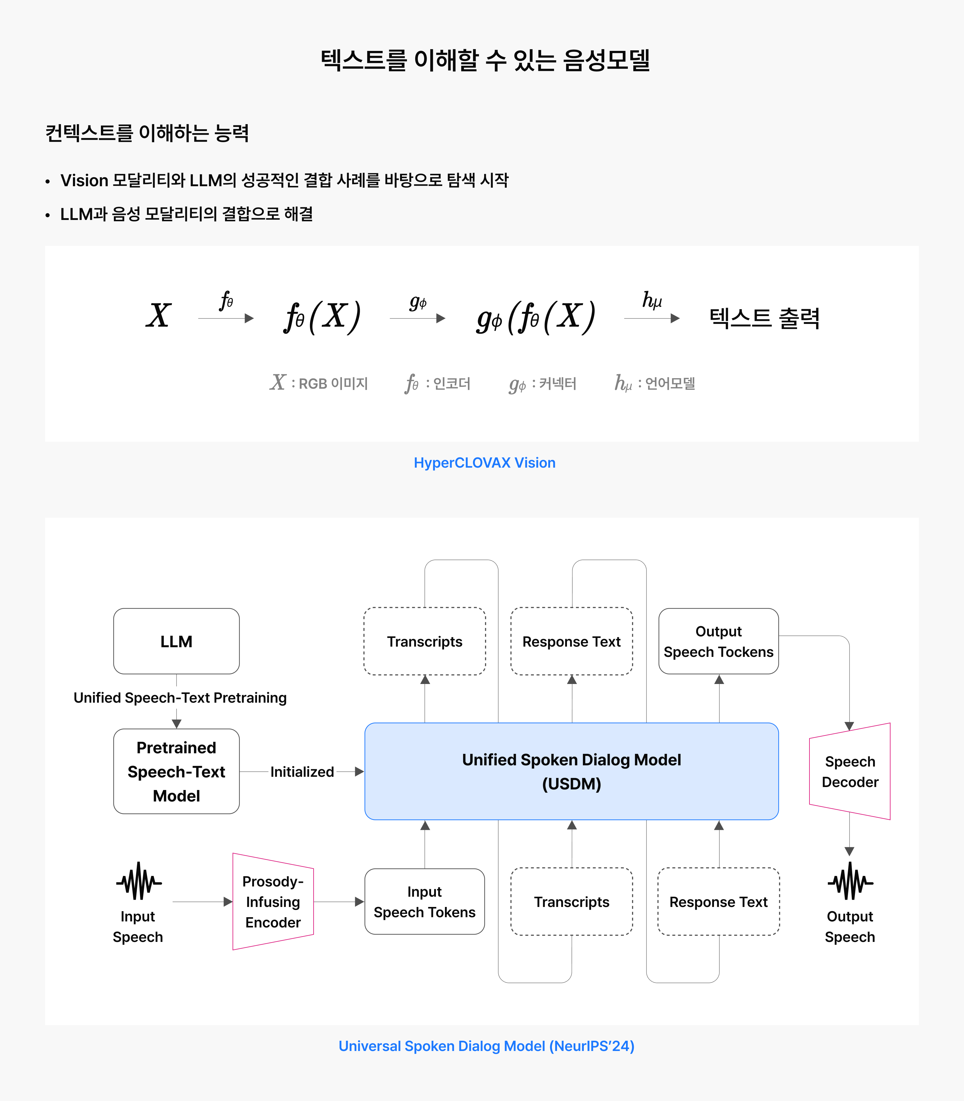 이를 위해 HyperCLOVA X Audio는 음성을 그대로 입력받아 바로 음성으로 응답하는 통합형 음성 LLM 구조를 채택했습니다. 기존처럼 각 단계를 나눠 처리하는 것이 아니라, 한 번에 자연스럽게 처리하는 구조로 진화한 것입니다.