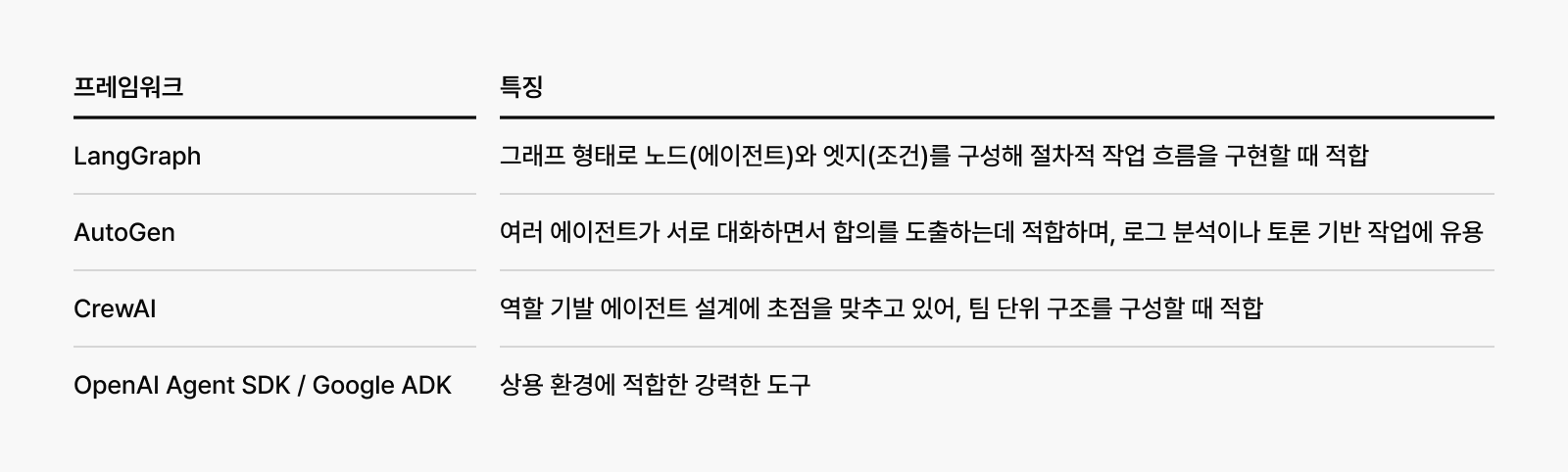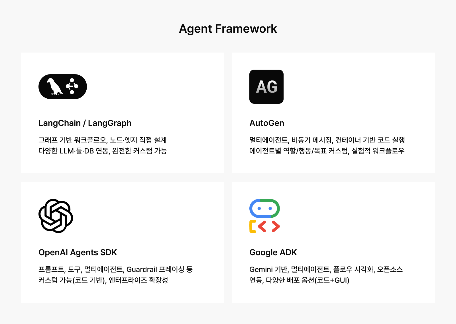 멀티 에이전트를 구현하기 위해서는 적절한 프레임워크 선택이 중요합니다. 업무 성격과 목적에 따라 아래 도구를 유연하게 조합해 볼 수 있습니다.