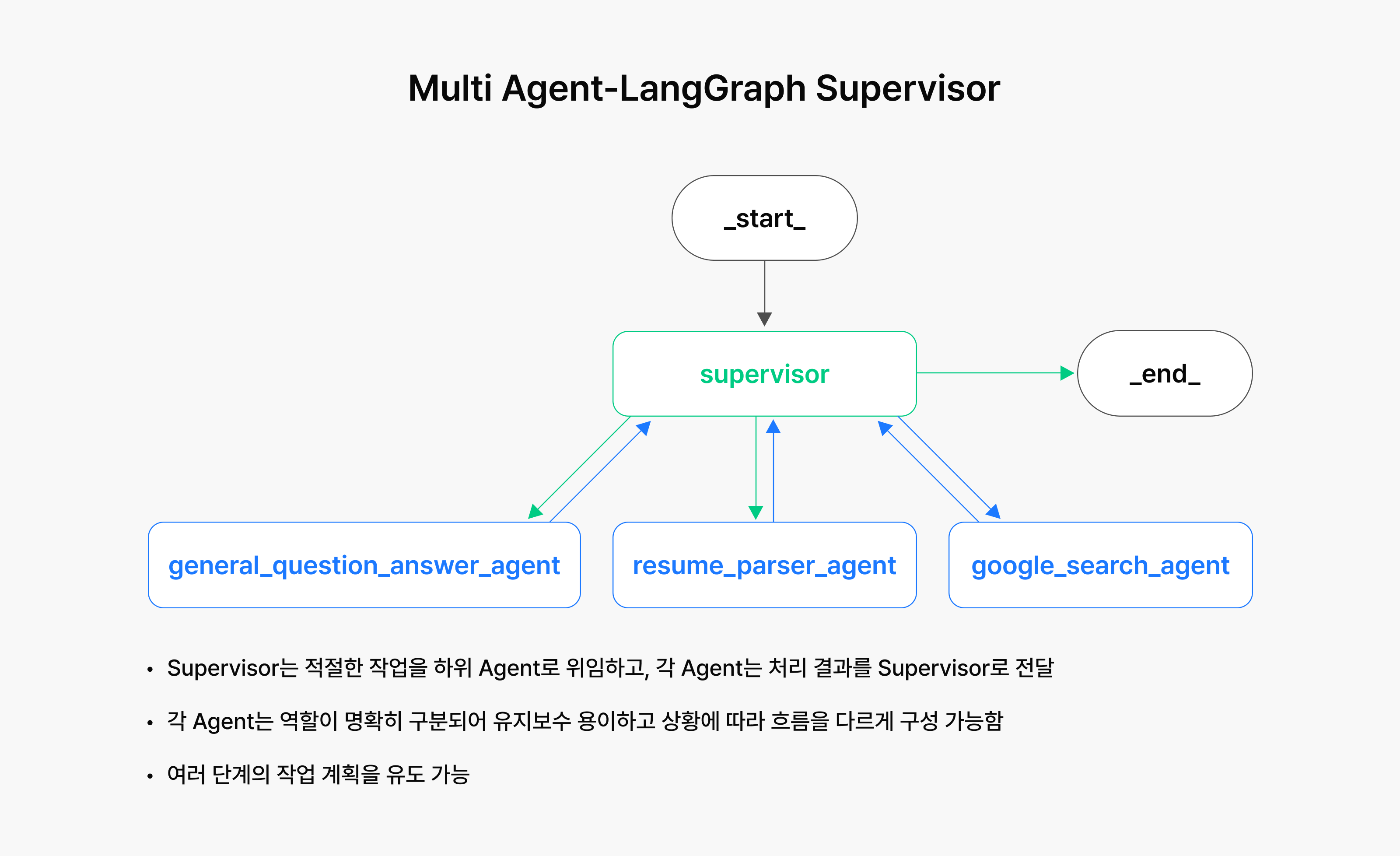 - 상위 슈퍼바이저 에이전트가 하위 에이전트를 지휘하며 작업