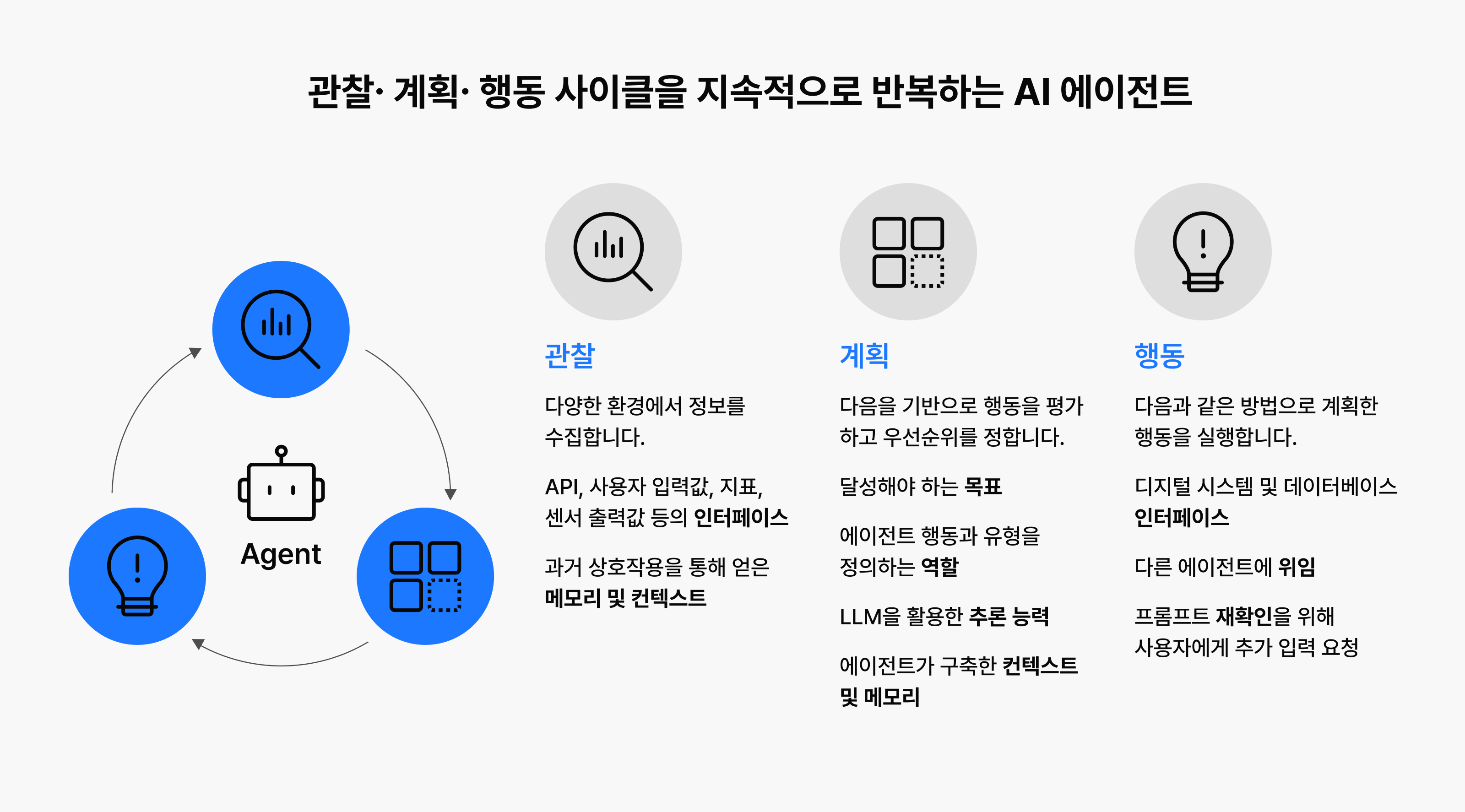 에이전트는 다음과 같은 사이클로 작동합니다: Observe(관찰) → Plan(계획) → Act(실행)