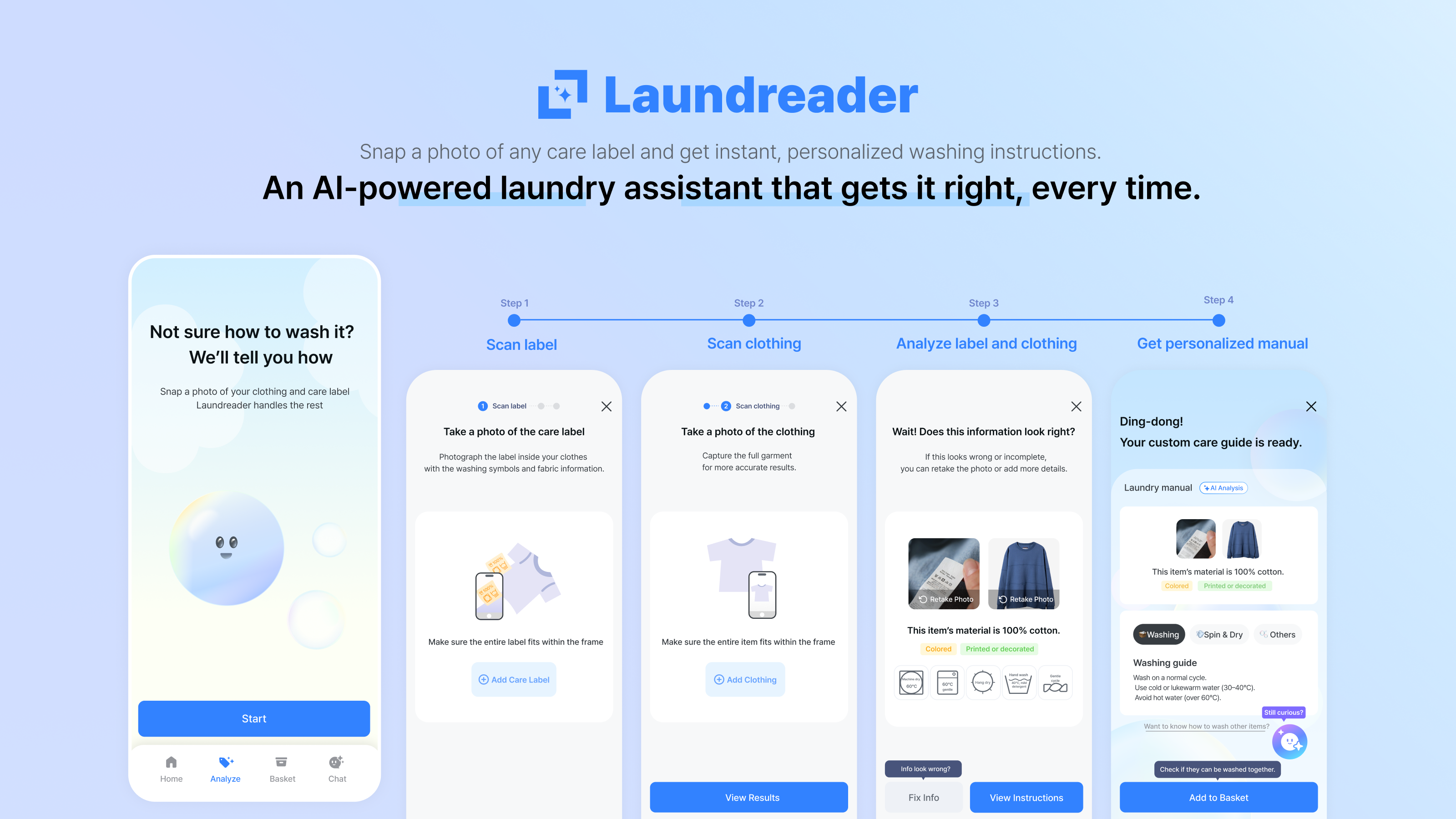 Eunsoo (Planner): Traditional laundry services focus on doing the washing for you. We wanted to empower users instead—providing a tailored solution to help them understand how to care for their clothes properly. Beyond washing guidance, Laundreader provides drying and storage instructions. When washing multiple items, our Basket feature checks fabric compatibility so users can plan efficient care routines. For those curious about fabric care, the Laundry Encyclopedia and real-time chatbot offer additional insights.