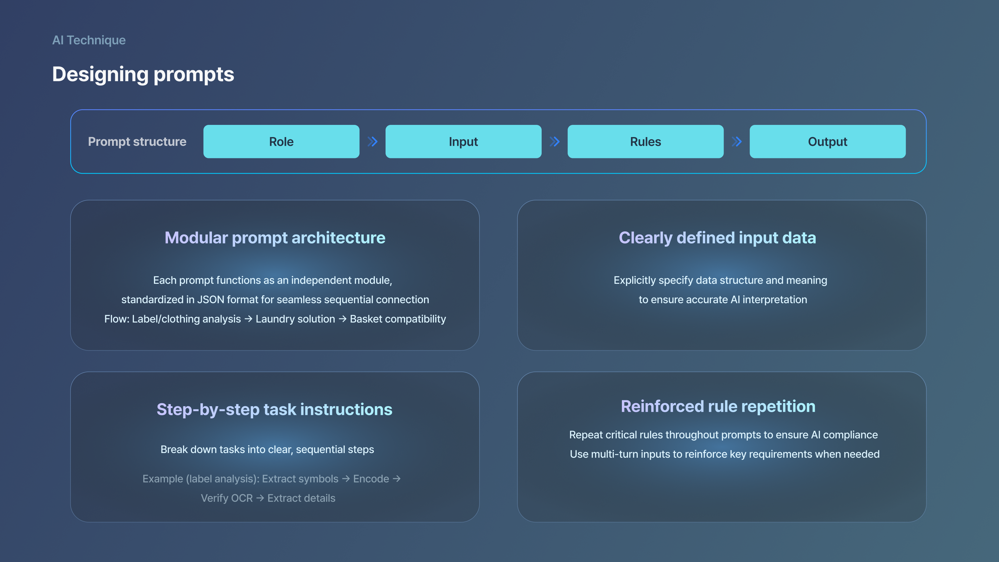 We broke each prompt into independent modules and standardized them using JSON—a text-based format that’s easy to read and write—then connected them in sequence. We made input data as specific as possible so the AI wouldn’t get confused, and laid out step-by-step instructions to improve accuracy. We also repeatedly reinforced key rules to minimize errors. This structured approach helped our AI models clearly understand their role at each step, leading to more reliable and consistent results.