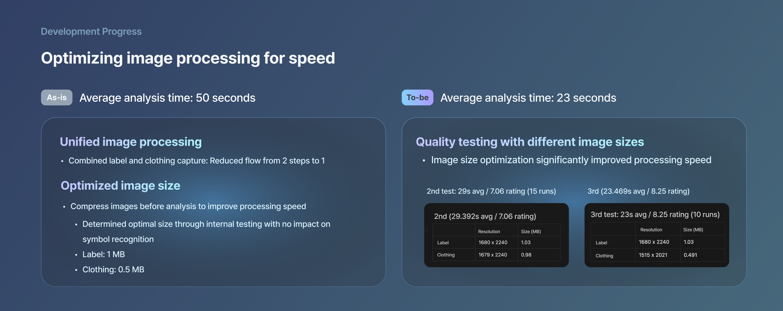 First, we ran multiple tests on the relationship between image file size and response time to find the optimal image dimensions. We also streamlined our original process—which analyzed laundry labels and clothing photos separately—into a single integrated workflow, cutting total processing time by nearly half.