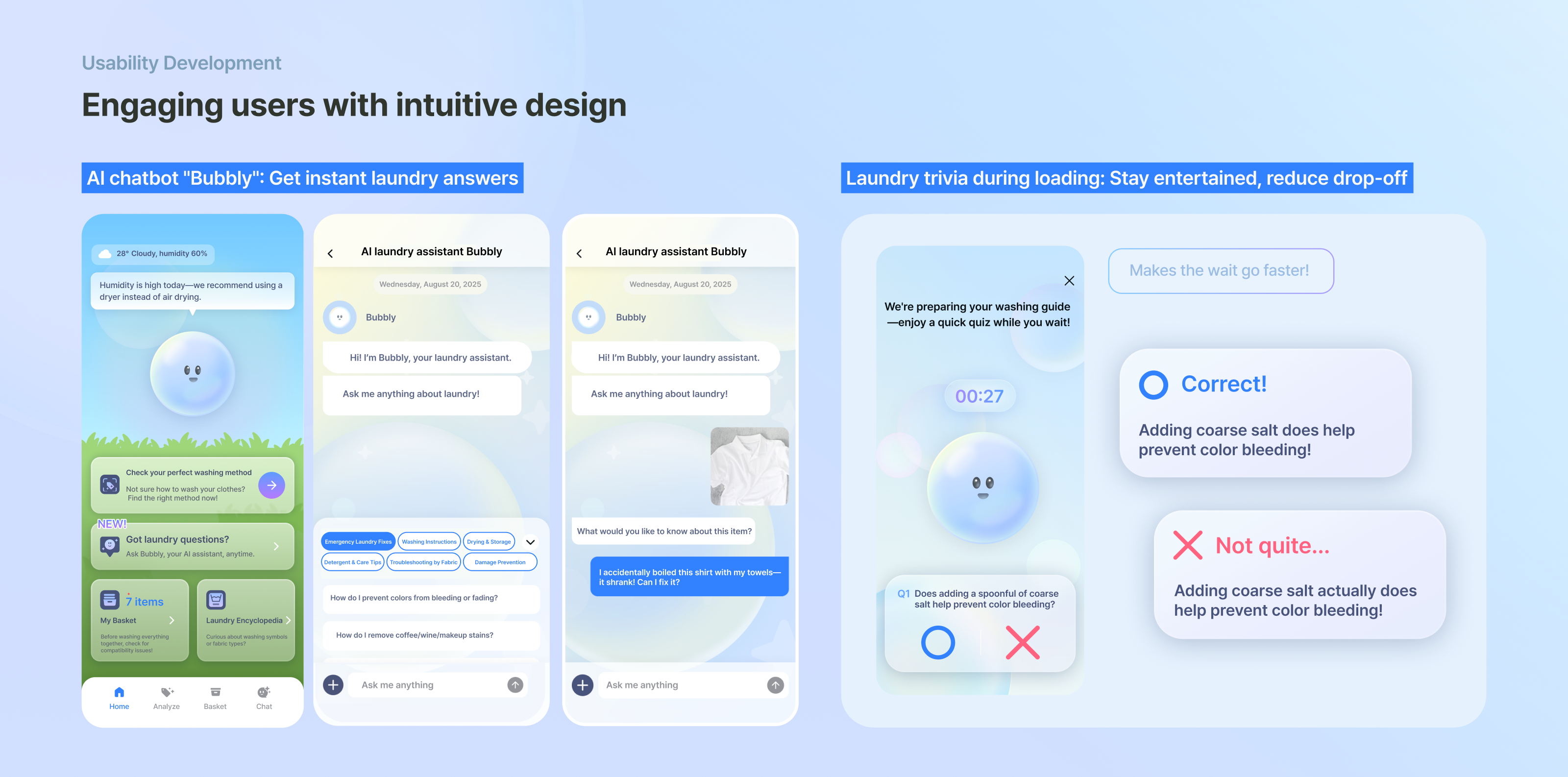 Chungu: We spent a lot of time on UI and UX to help users feel comfortable with the AI features. We wanted the washing advice to sound like tips from a friendly laundry expert, so we made the tone conversational and warm. We also created a cute mascot called “Bubbly” to make the whole experience more welcoming.