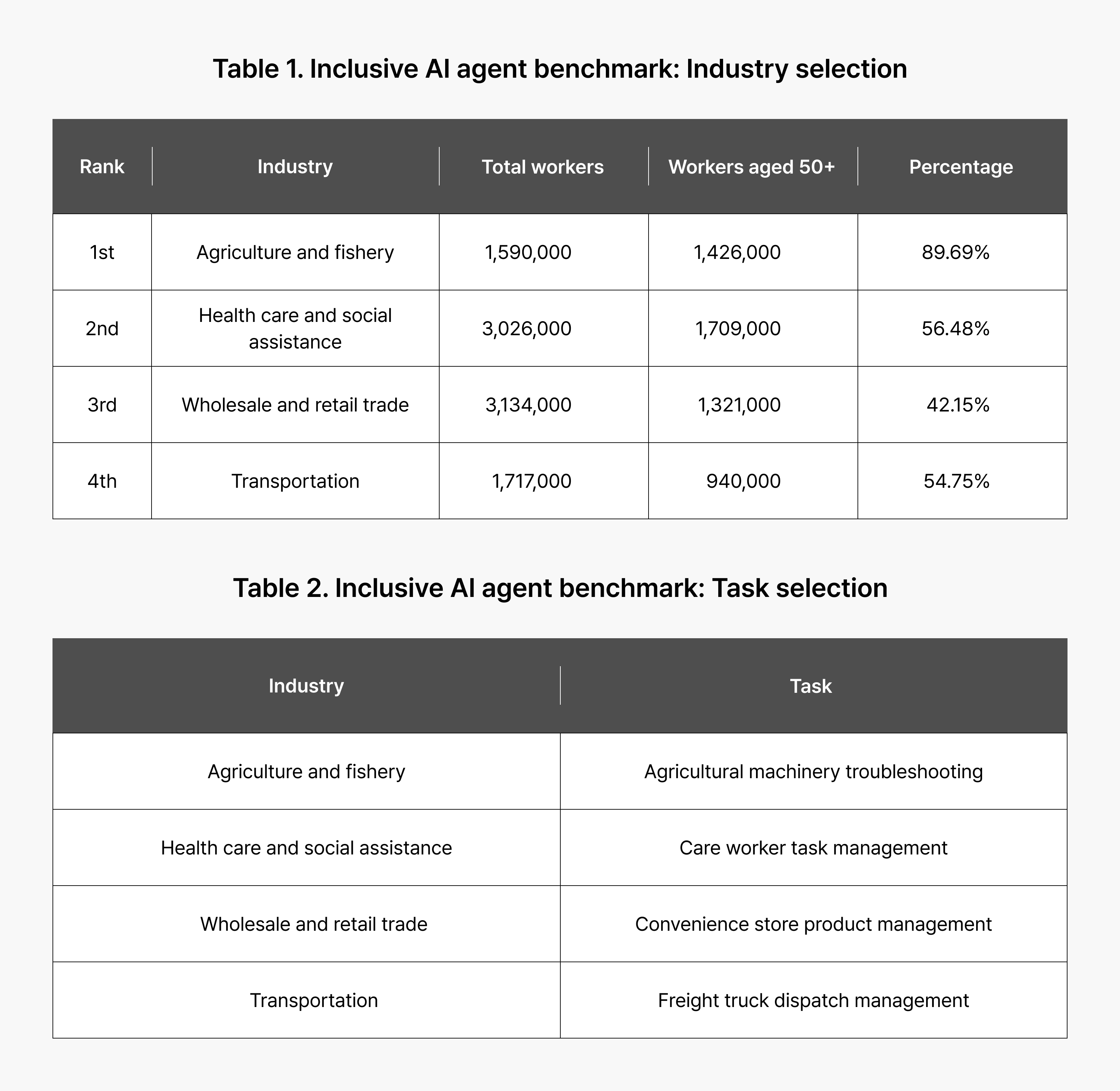 This distribution is telling. Older workers are actively employed across industries, but they are disproportionately concentrated in sectors where technological benefits are harder to access. The implication is clear: we need to identify which fields an inclusive AI agent should serve, what tasks it should perform, and how benchmarks for evaluating model performance on these tasks should be designed.