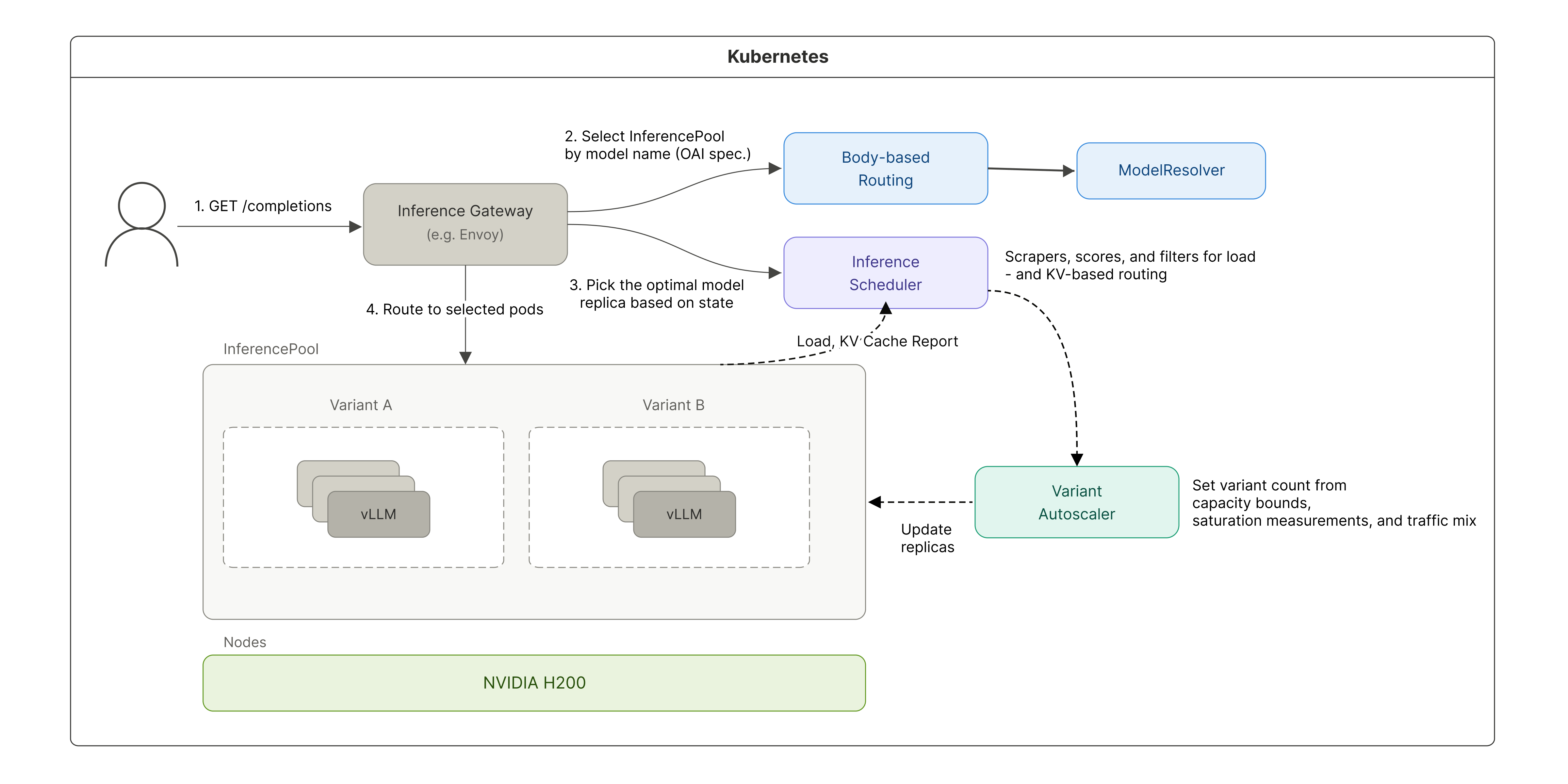 - Step 3: HttpRoute then routes to the appropriate model server group based on that header value.