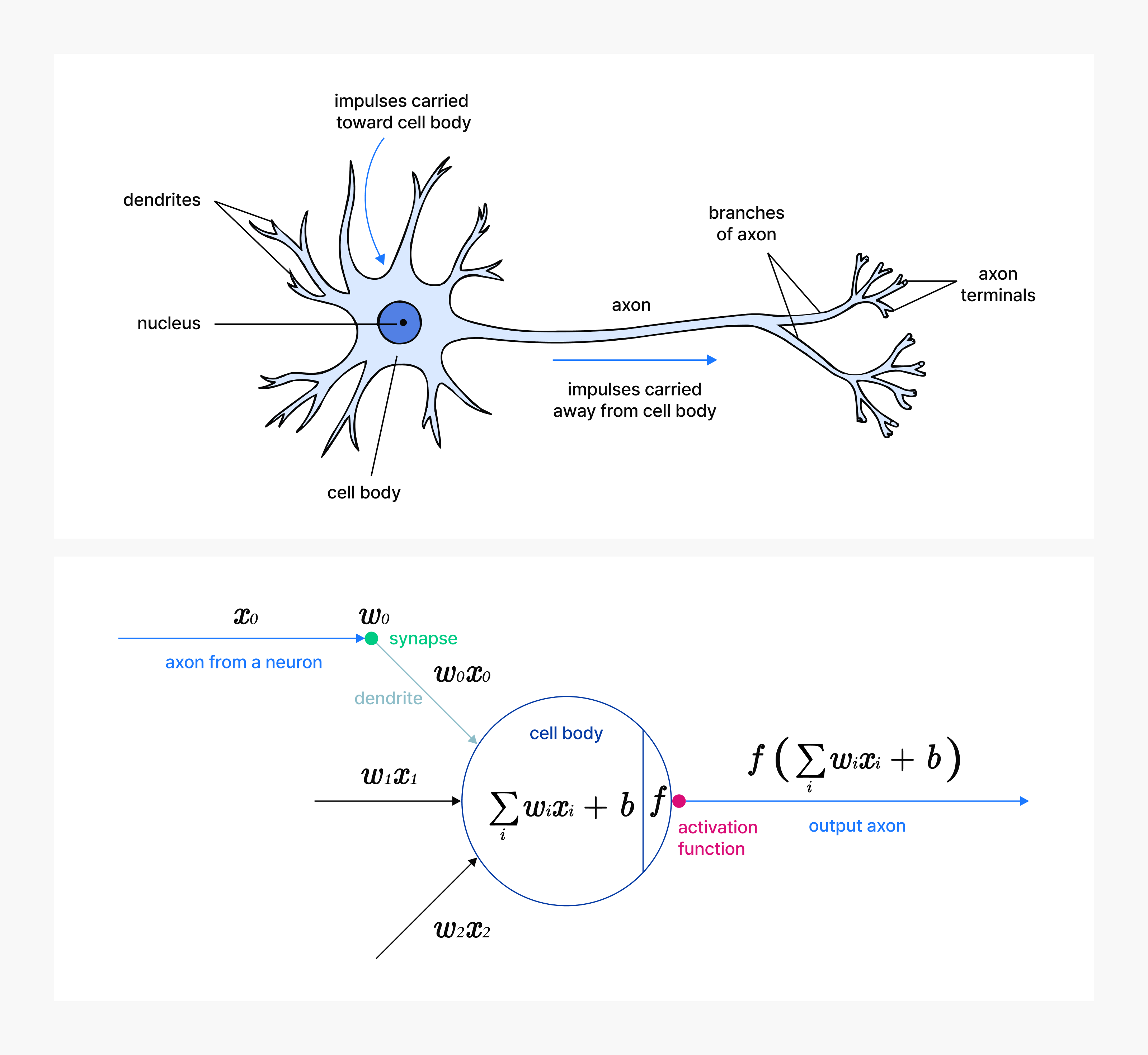 [Figure 1: A cartoon drawing of a biological neuron (up) and its mathematical model (down)]