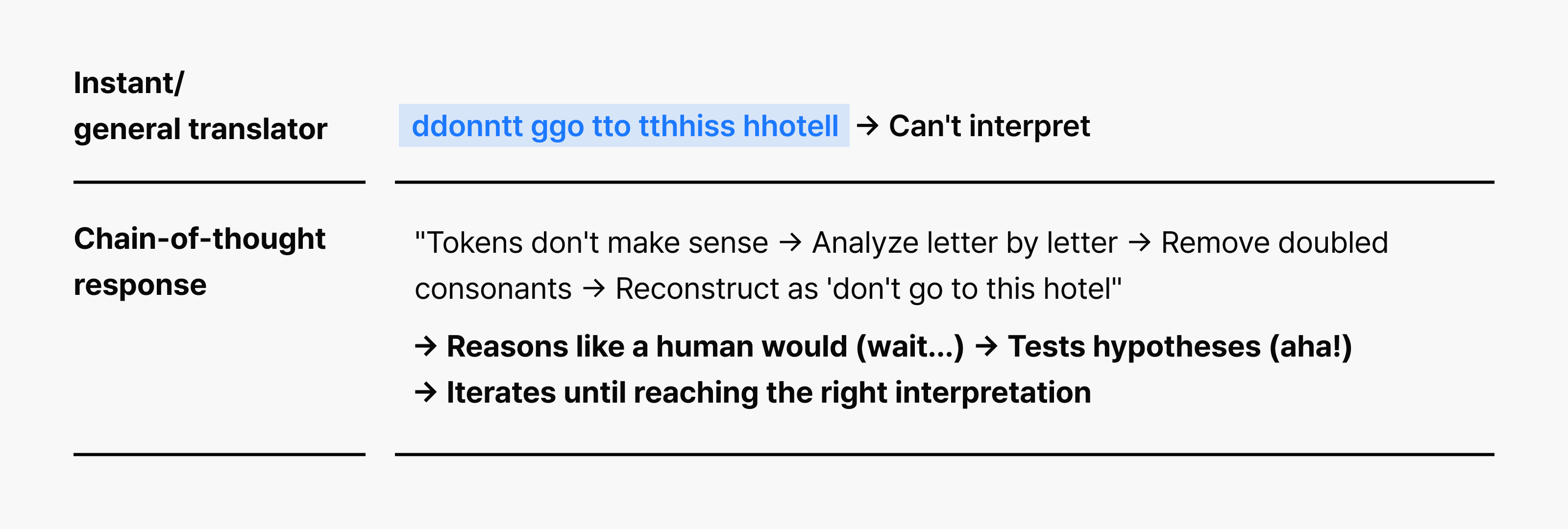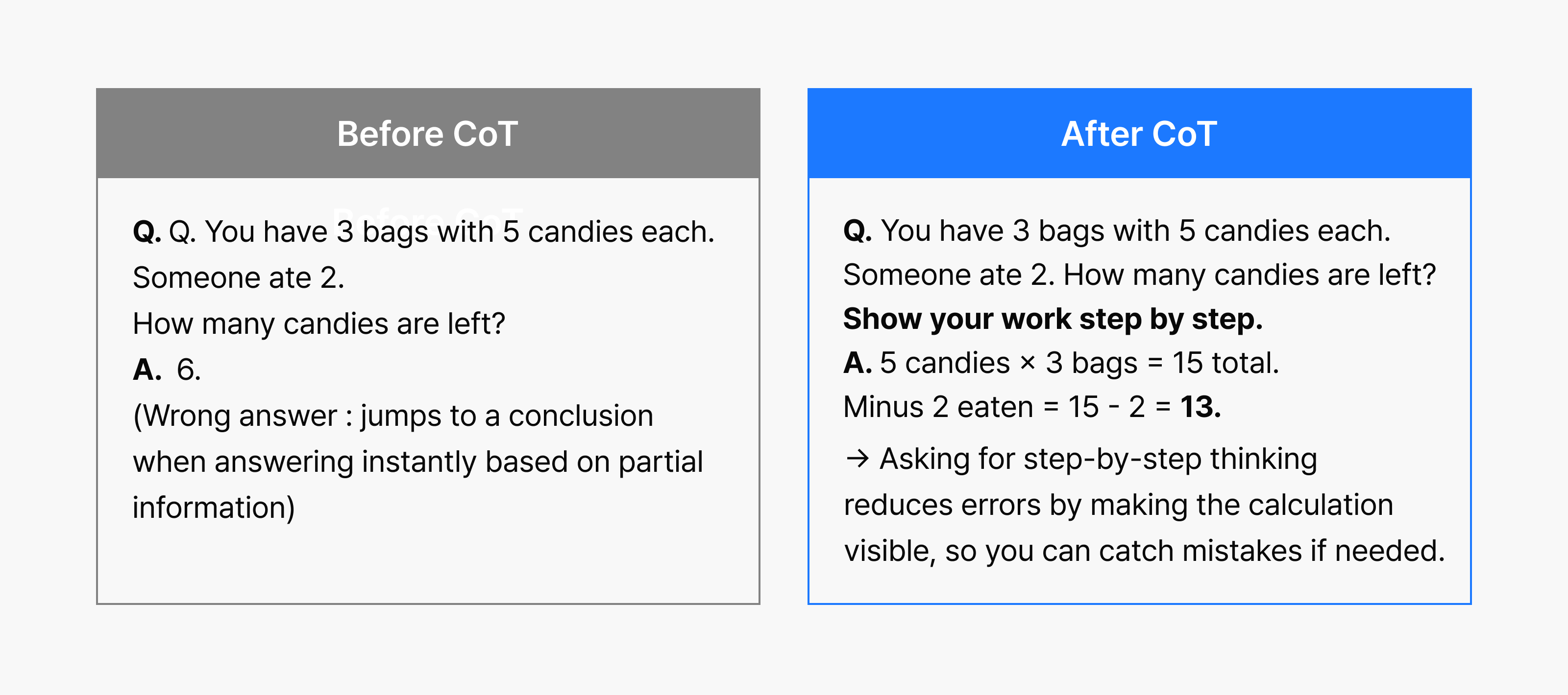 Chain-of-thought prompts change this default mode. They give the model more token budget (more time to think) and break questions into steps that expose intermediate results. This produces the following effects:
