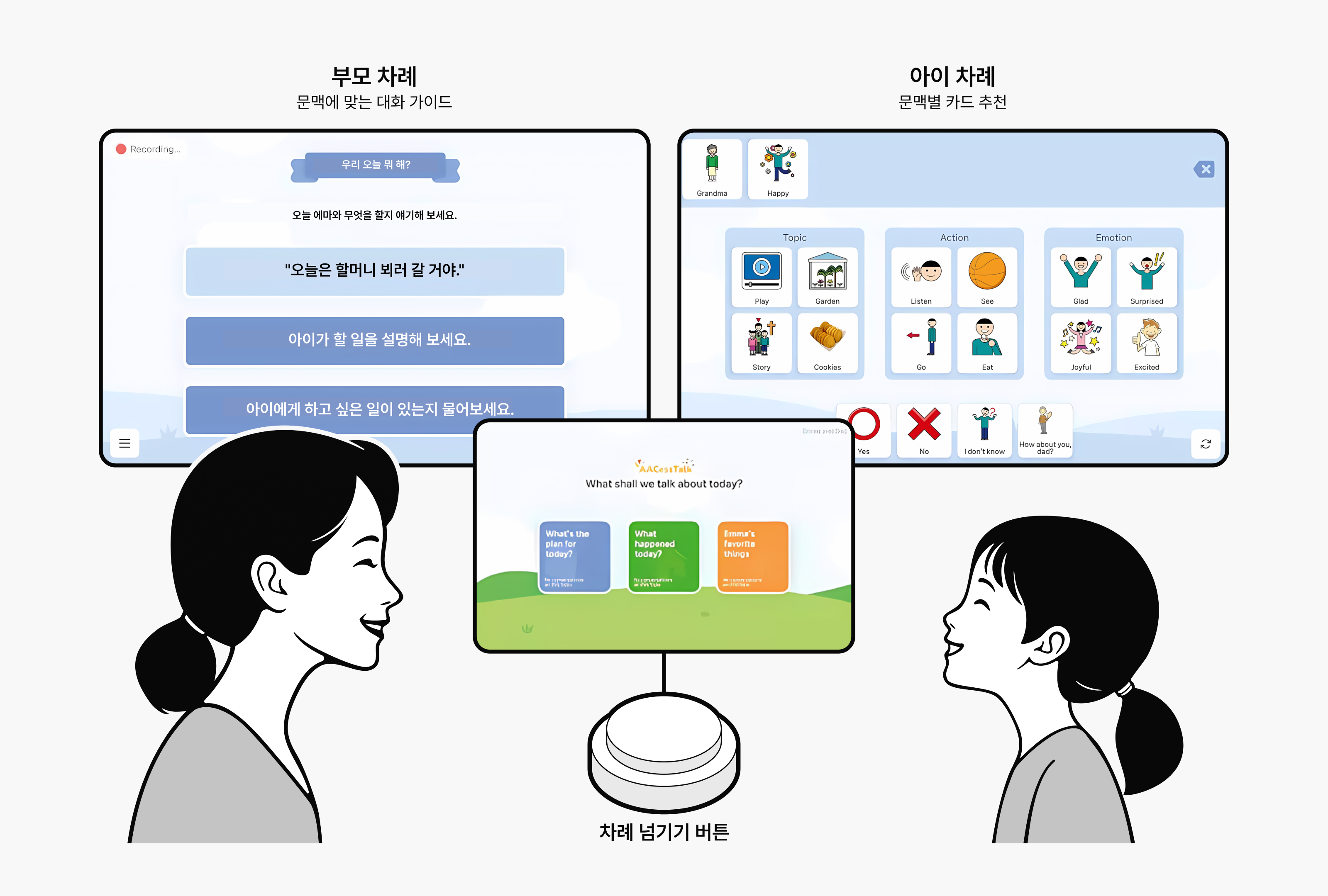 말이나 문장 표현이 어려운 무발화ㆍ저발화 자폐 아동과 부모의 대화는 마음만으로는 닿기 어렵습니다. 기존 AAC(보완ㆍ대체 의사소통) 도구는 미리 정해 둔 단어 카드 중심이라 기본 욕구 전달에는 도움이 되지만, 그때그때 달라지는 일상 대화로 자연스럽게 확장되기엔 한계가 있었죠.