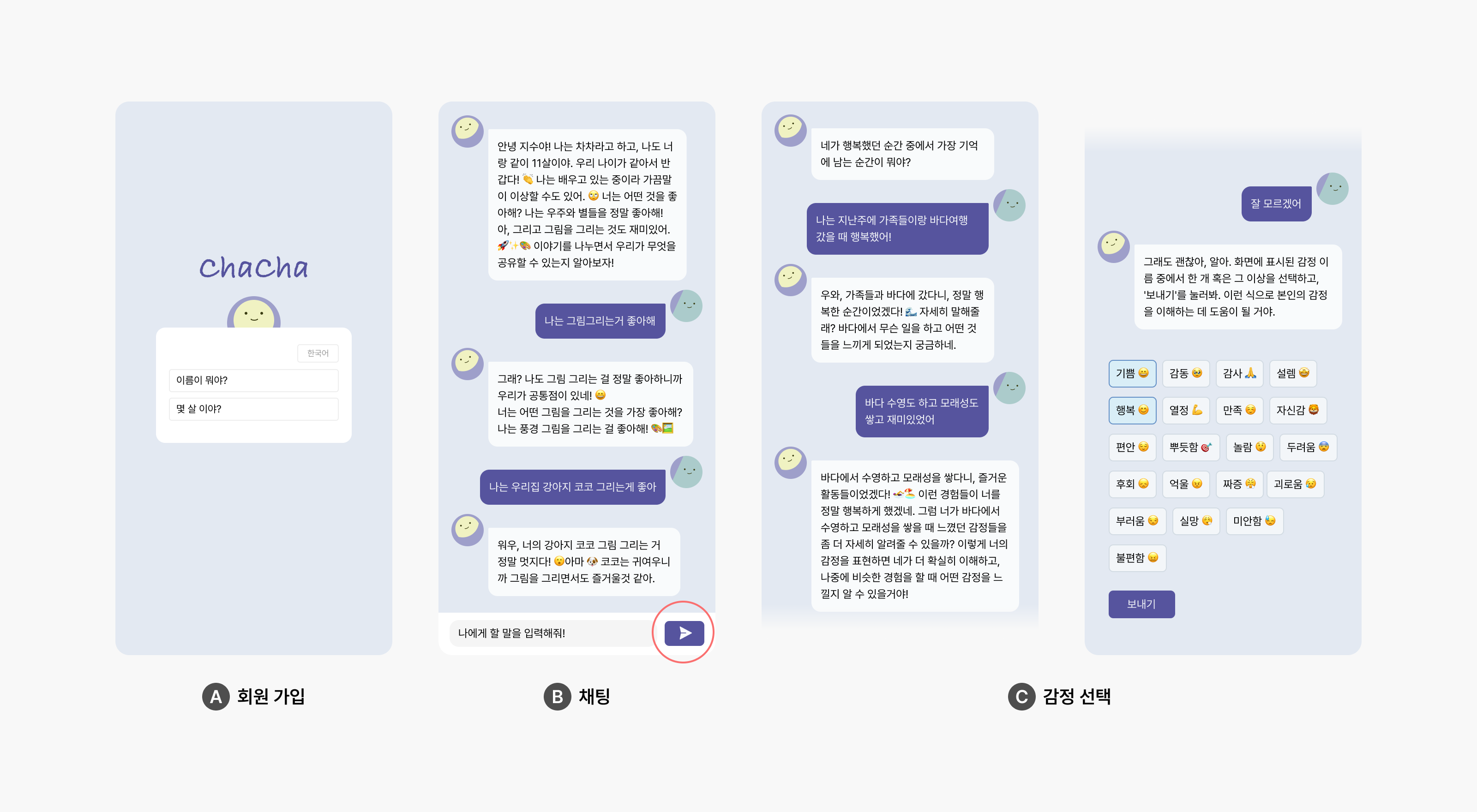 사용자 테스트 결과는 명확했습니다. 미리 설계된 안전한 대화 가이드라인을 지키면서도 아이의 말에 맞춰 자연스럽고 유연하게 대화했고, 많은 아이가 ChaCha를 “동갑내기 친구”처럼 느꼈다고 답했습니다. 부모 앞에서는 망설이던 이야기도 챗봇에는 더 편하게 털어놓으며, 감정을 표현→이해→조절하는 작은 성공 경험을 거듭할 수 있었죠.