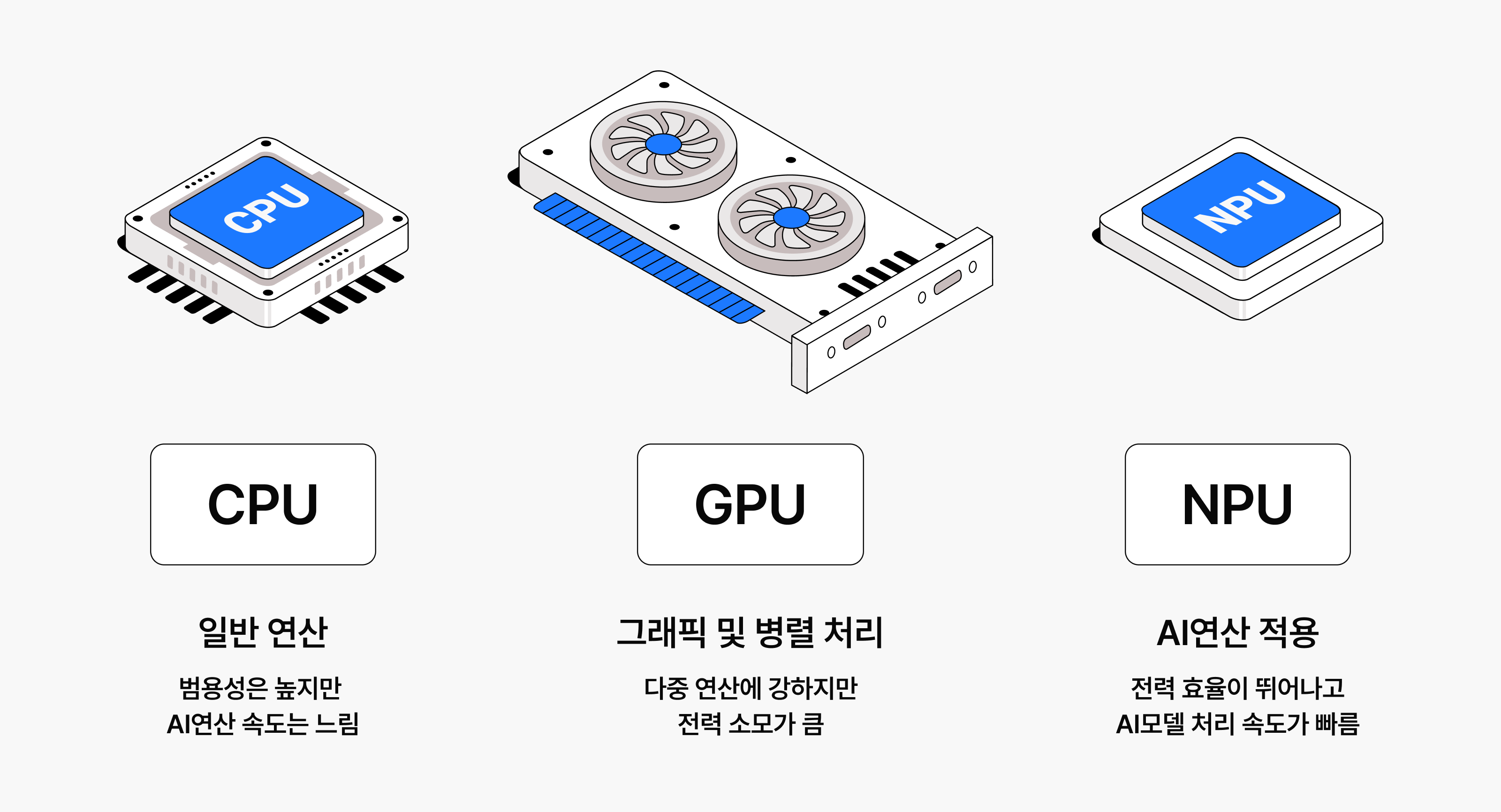 이러한 특성 때문에, 전통적인 CPU(Central Processing Unit) 기반 연산 구조만으로는 AI 연산을 효율적으로 처리하기 어렵습니다. CPU 다양한 작업을 유연하게 처리할 있도록 설계된 반도체로, 보통 1~8개의 코어를 기반으로 직렬 처리 최적화되어 있습니다. 명령어가 입력된 순서대로 하나의 연산을 마무리한 다음 연산을 수행하다 보니, 대규모 연산이 한꺼번에 몰리는 AI 작업 환경에서는 병목 현상이 발생하기 쉽습니다. 반면, GPU와 NPU는 대규모 행렬 연산에 특화된 구조이므로 AI 연산에서 훨씬 높은 효율을 발휘할 있죠.