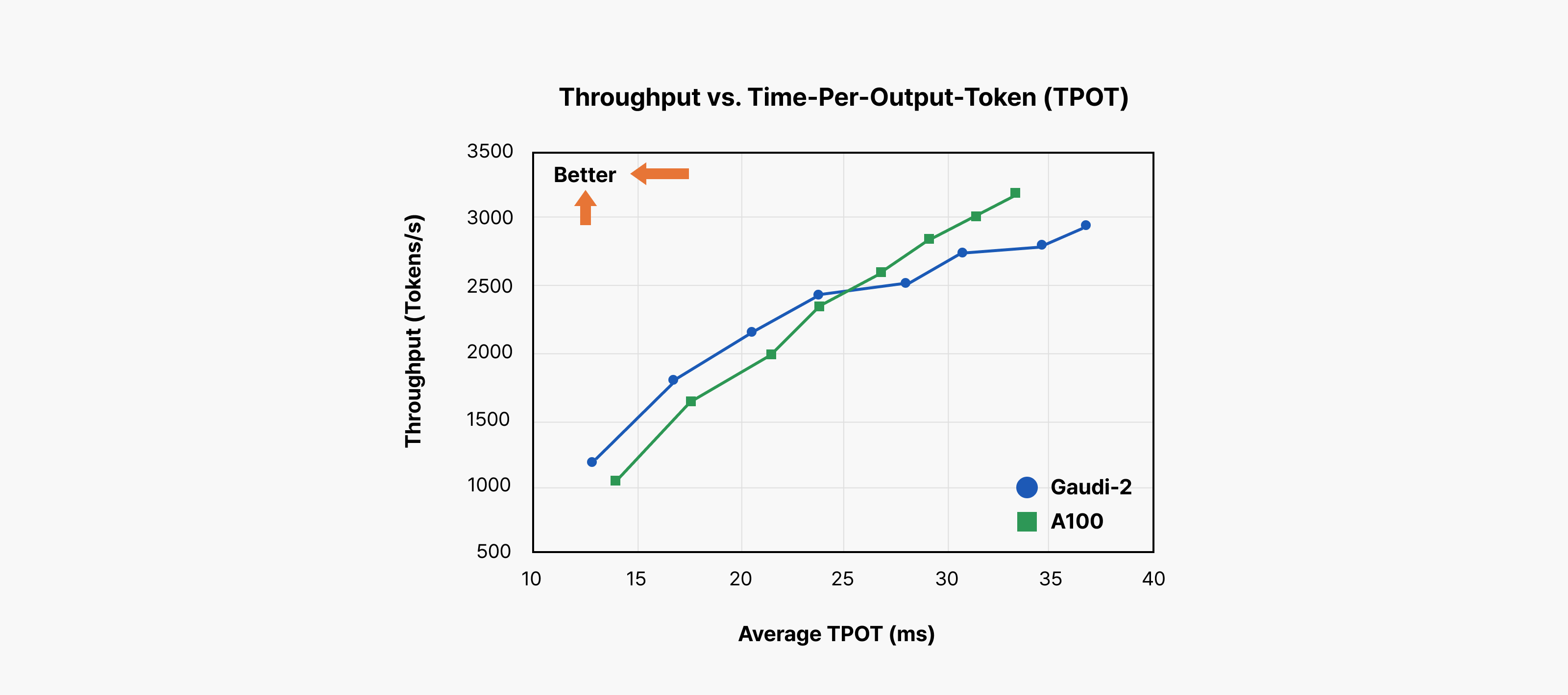 [그림 2]: 처리량 vs. 토큰 간 지연 시간 (출처: Intel Gaudi Introduction)